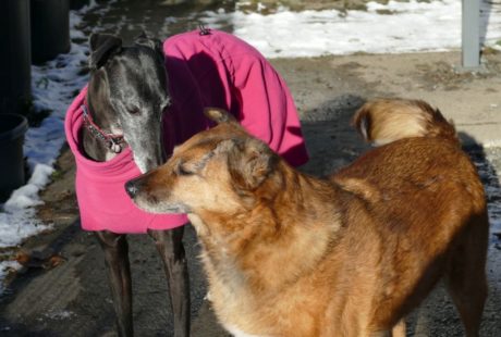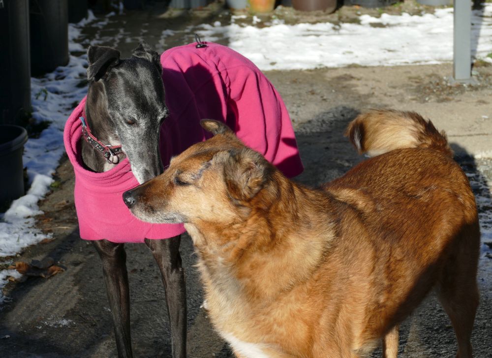 Guten Morgen liebe Tierfreunde: Du, Frieda, wie ist deine Meinung so zu Schnee?, Der Schnee ist mir ziemlich egal. Aber warum bekommst du ein Mäntelchen an und ich nicht? Das ist eher die Frage, die mich beschäftigt. Wir wünschen euch einen schönen Tag, eure Pandora und Frieda.